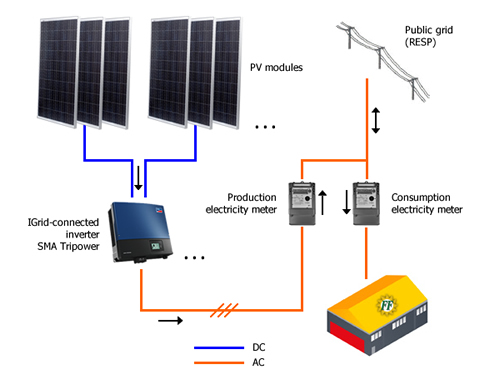 A Small Grid Feed-in Unit is a production unit with an installed power less or equal to 250kW. These systems use one single energy source and inject all the electricity they produce into the public electric power service grid (RESP).