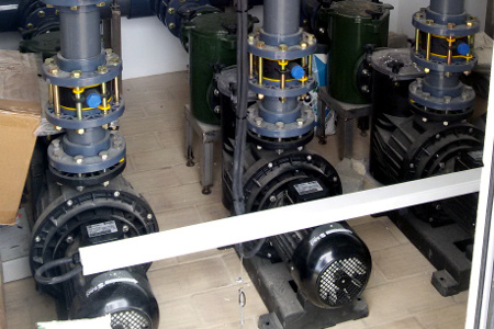 Recirculação de água de uma piscina com 1200 m³ (três bombas de superfície, 600 m³/dia).